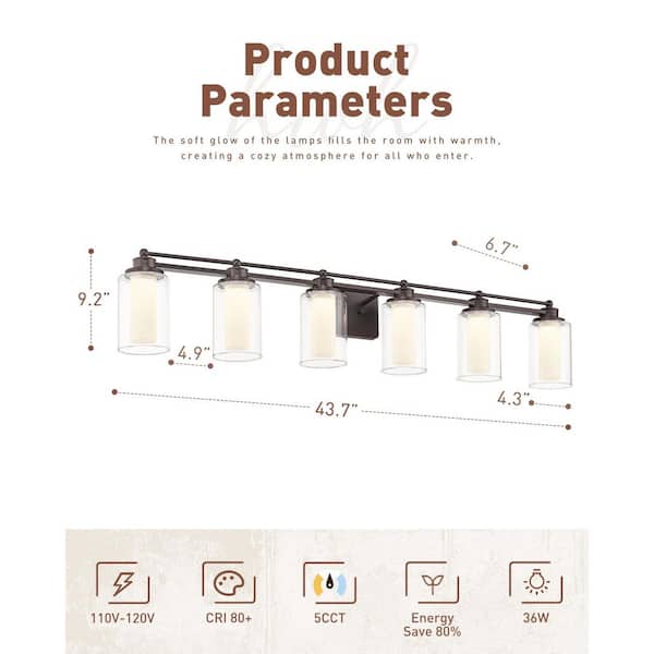 Modern 42.7 in. 6 Light Oil-Rubbed Bronze 36W 5CCT LED Vanity Light with Frosted Acrylic Shade