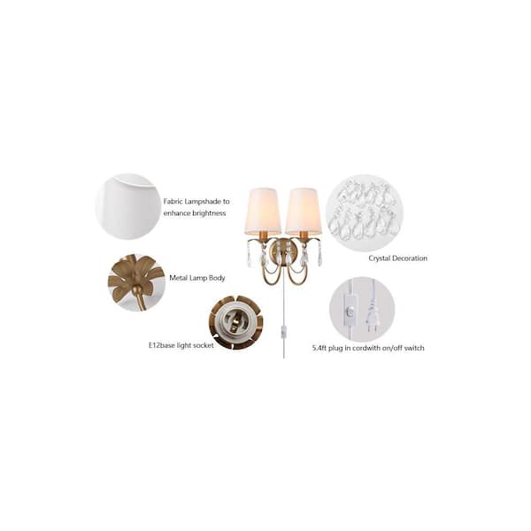 Luxurious Indoor 10.2 In. Classic 2 light Gold Crystal Plug-in Wall Sconces with White Fabric Shade Wall-Mount Light