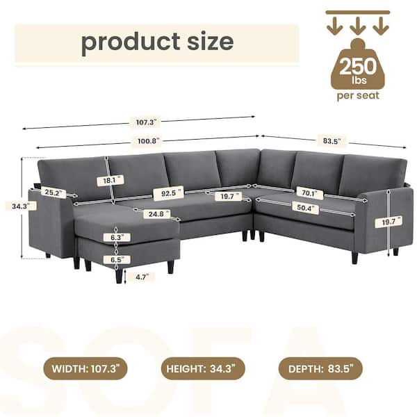 107.3 in. Width Convertible Large U-Shaped Fabric Sofa Couch, Large 7-Seater Sectional Sofa with 1 Ottoman in. Dark Gray