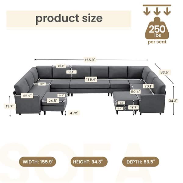 155.9 in. Width Linen Convertible Large U-Shaped Shaped Sofa Couch, Large 12-Seater Sofa with 2 Ottomans in Dark Gray