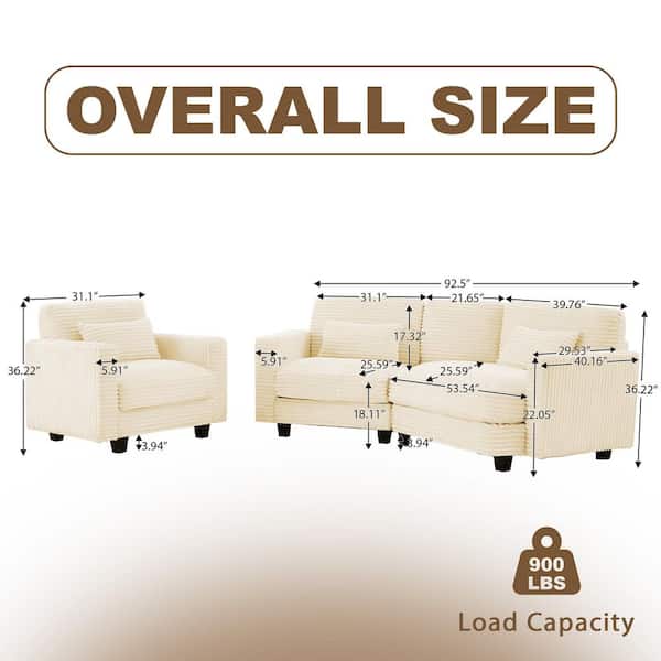 2-Piece Beige Curved Corduroy Velvet Living Room Sofa Set includes 2 Seater plus Single Sofa