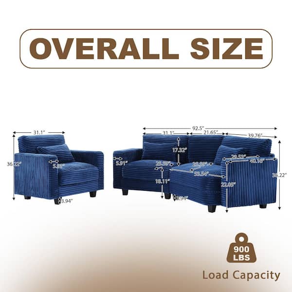 2-Piece Navy Curved Corduroy Velvet Living Room Sofa Set includes 2-Seater plus Single Sofa