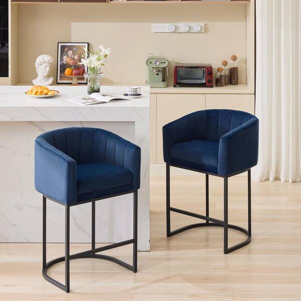 25.9 in. Modern Navy Blue Upholstered Fabric Bar Stools with Curved Back and Metal Base (Set of 2)