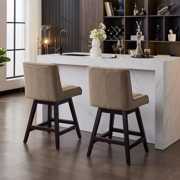 26.4 in. Brown Fabric Upholstered 360° Swivel Bar Stool Solid Wood Counter Height Stool (Set of 2)