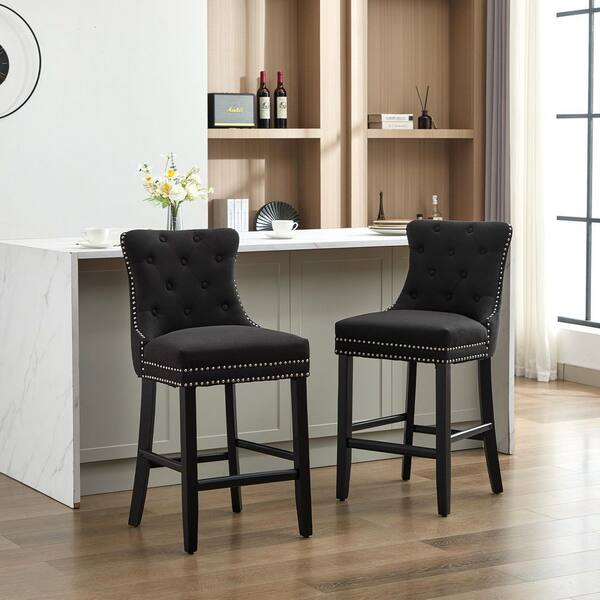 27.56 in. Black Fabric Upholstered Seat Solid Wood Leg Bar Tool, Breakfast Chairs with Back (Set of 2)