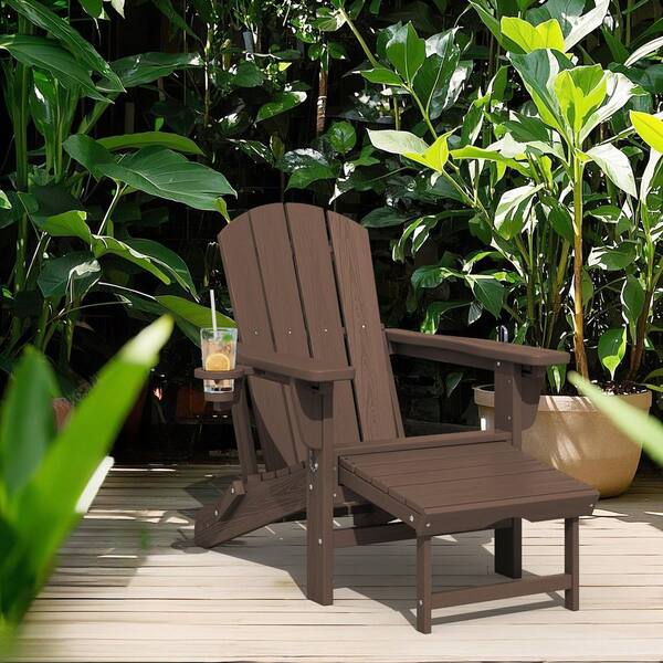3-Level Adjustable Patio Folding Plastic Adirondack Chair with Retractable Ottoman, Cup and Phone Holders in Coffee
