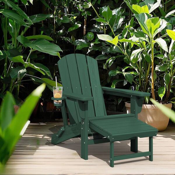 3-Level Adjustable Patio Folding Plastic Adirondack Chair with Retractable Ottoman, Cup and Phone Holders in Dark Green