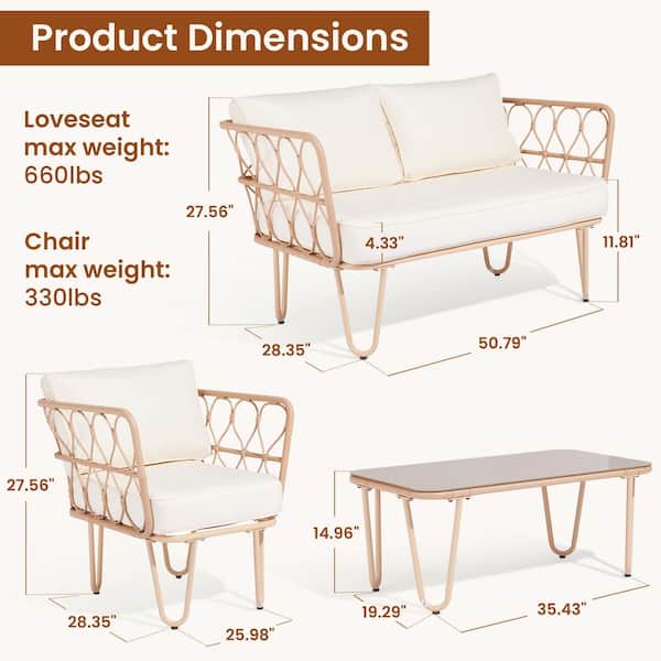 4-Piece Beige Wicker Patio Conversation Set Loveseat with Cushions and Coffee Table