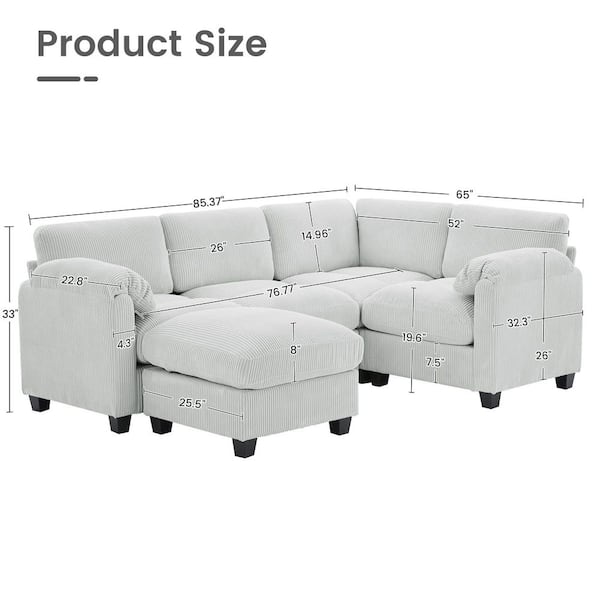 85.37 in. Corduroy Modular L-Shaped 5-Seat Sectional Sofa in Grey for Living Room and Spacious Space