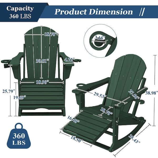 Adirondack Plastic HDPE Folding Outdoor Rocking Chair with Retractable Ottoman and Cup Holder for Patios in Dark Gray