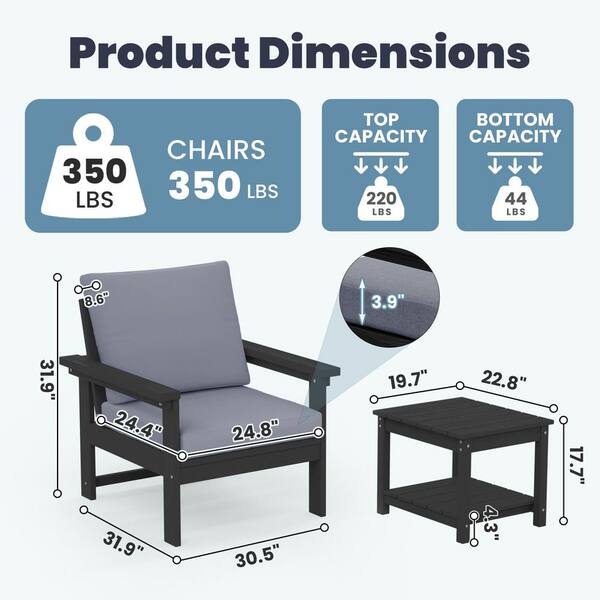 Black 3-Piece Eco-Friendly HDPE Patio Seating Set Conversation Set with Gray Cushions and Side Table