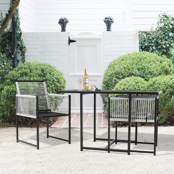 Black 3-Piece Metal Rectangular Glass Tabletop Table Patio Outdoor Dining Set with Rattan Foldable Backrest Chairs