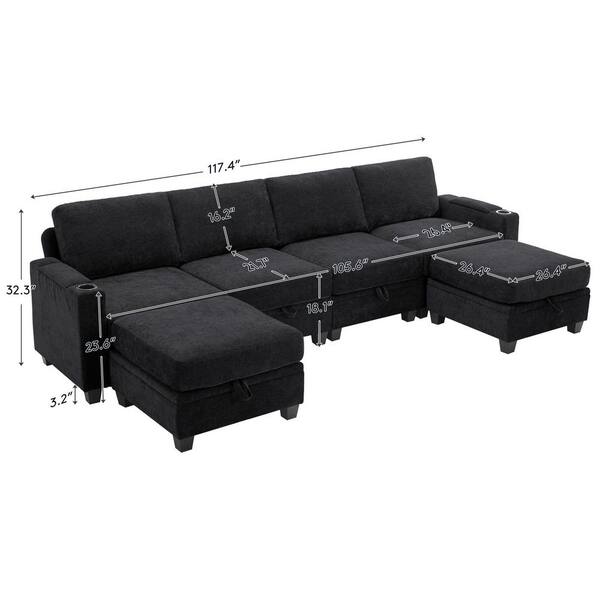 Modern 117.4 in. Black Chenille Square Arm Rectangle Shape Storage Sofa with Cup Holder and Two Ottomans for Living