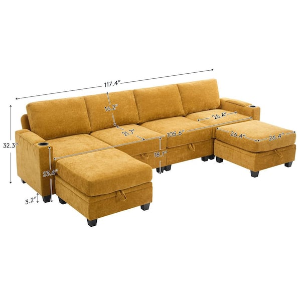 Modern 117.4 in. Gold Chenille Square Arm U-Shaped Storage Sofa with Cup Holder and Two Ottomans for Living