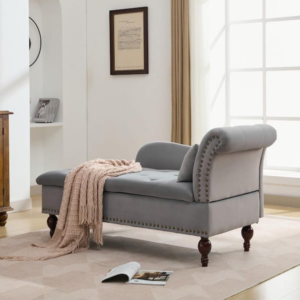 Modern Button Tufted Rivets Velvet Upholstered Storage Chaise Lounge Chair with Solid Wood Legs and Lumbar Pillow,Gray