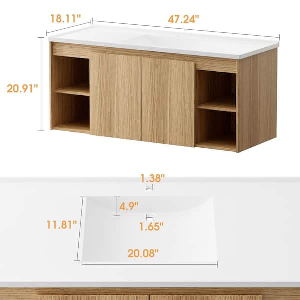 Natural Wood 48 in. Single Sink Floating Bath Vanity with White Resin Top, 2-Soft-Closing Doors and 4-Shelves