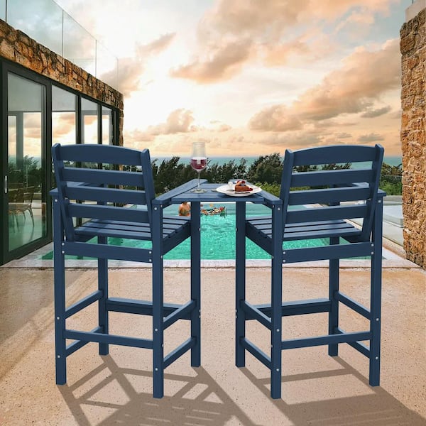 Navy Modern HDPE Plastic Adirondack Chairs, Outdoor Bar Stools with Connecting Tray (Set of 2)