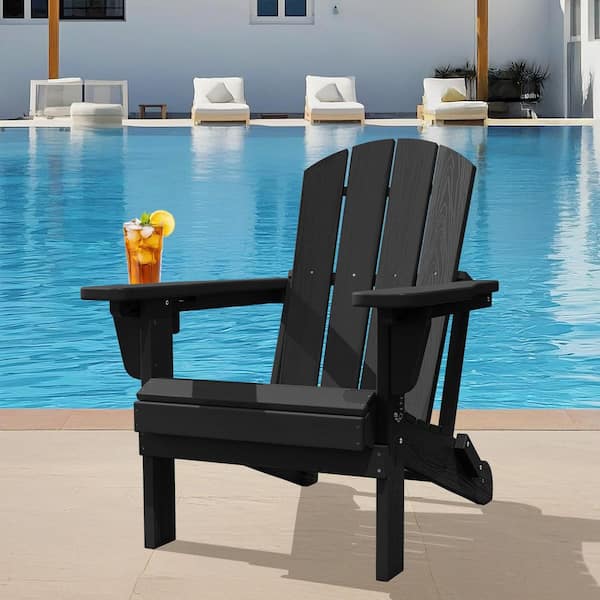 Weather Resistant Plastic HDPE Outdoor Patio Folding Adjustable Adirondack Chair with Cup Holder in Black