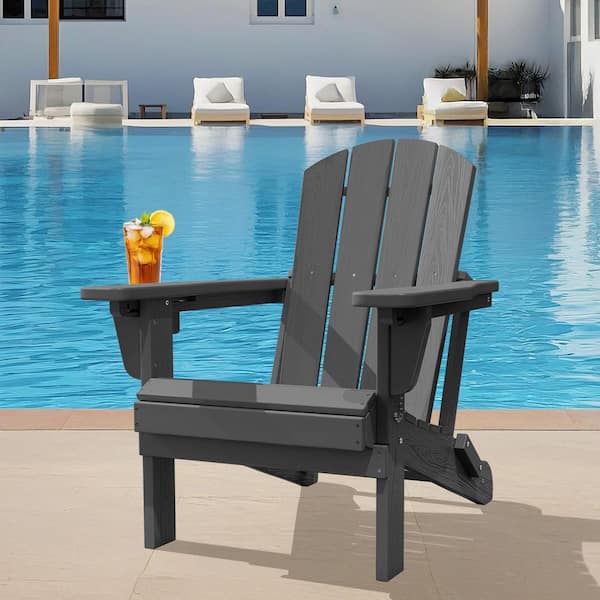 Weather Resistant Plastic HDPE Outdoor Patio Folding Adjustable Adirondack Chair with Cup Holder in Gray