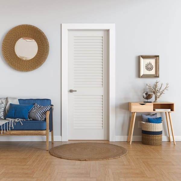 24 in. x 80 in. 2 Panel Louver Right-Handed Solid Core Primed Wood Single Prehung Interior Door with Satin Nickel Hinges