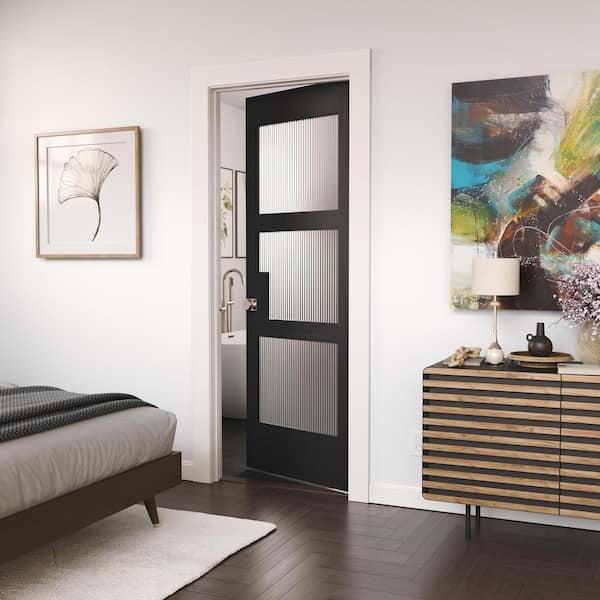 30 in. x 80 in. Right-Handed 3 Lite Reeded Glass Black Stain Solid Core Wood Single Prehung Interior Door w/ Flat Jamb