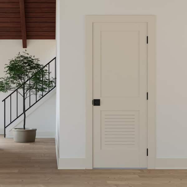 32 in. x 80 in. 2 Panel Right-Handed Primed MDF Wood Single Prehung Interior Door Lower Modern Ventilated Panel Louver