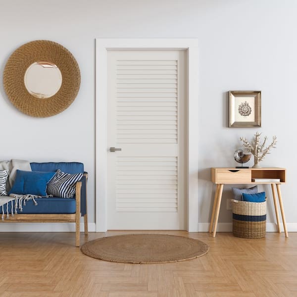 36 in. x 80 in. 2 Panel Louver Right-Handed Solid Core Primed Wood Single Prehung Interior Door w/ Satin Nickel Hinges