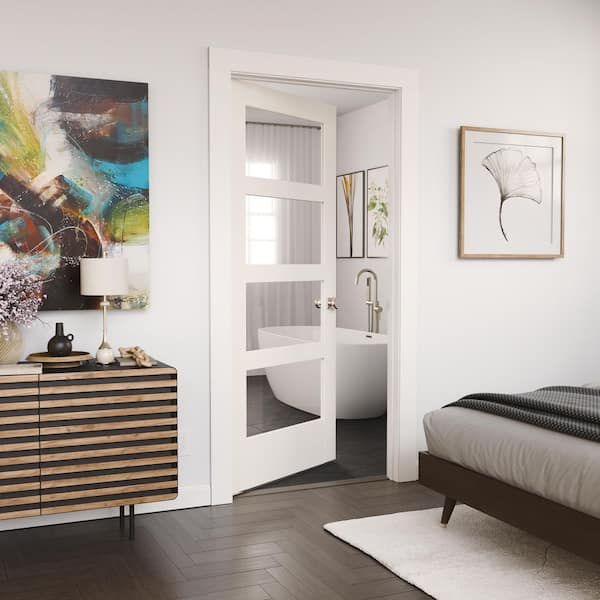 36 in. x 80 in. Left-Handed 4 Lite Clear Glass Primed Solid Core Wood Single Prehung Interior Door with Flat Jamb
