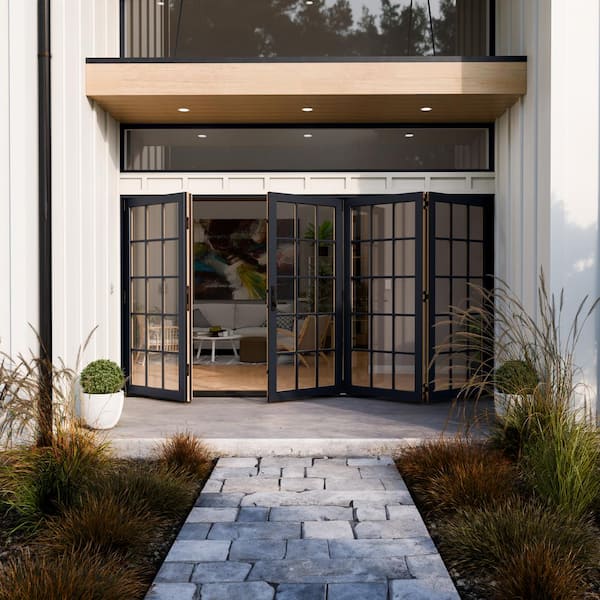 W5500 124 in. x 80 in. Black Left Hand/Outswing Aluminum Clad Wood 4-Panel Prehung Folding Patio Door w/15-lite grid