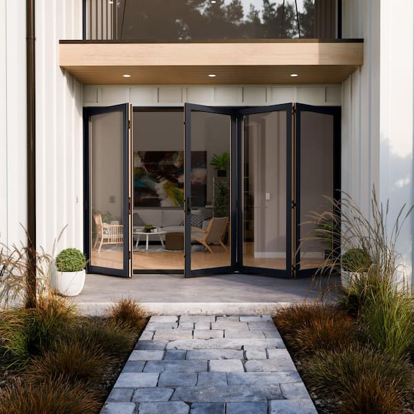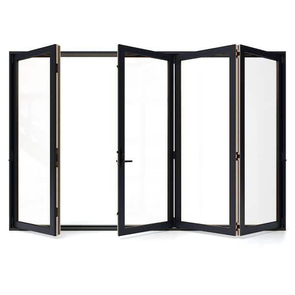 W5500 124 in. x 96 in. Black Left Hand/Outswing Aluminum Clad Wood 4-Panel Prehung Folding Patio Door
