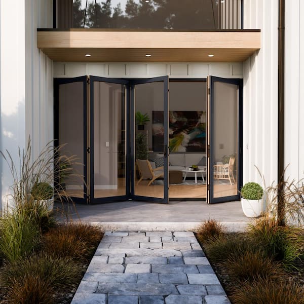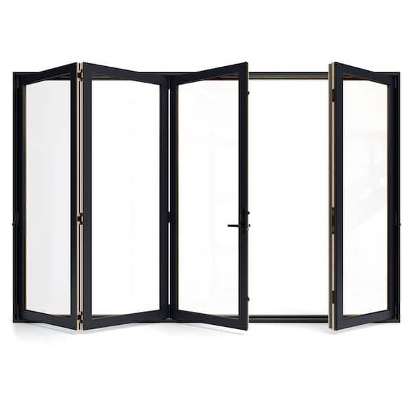 W5500 124 in. x 96 in. Black Right Hand/Outswing Aluminum Clad Wood 4-Panel Prehung Folding Patio Door