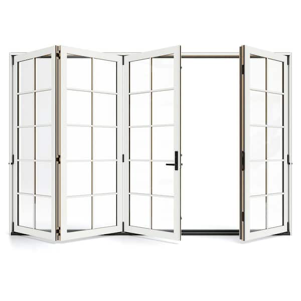 W5500 124 in. x 96 in. Modern White RightHand/Outswing Aluminum CladWood 4-Panel Prehung Folding Patio Door 10-Lite Grid