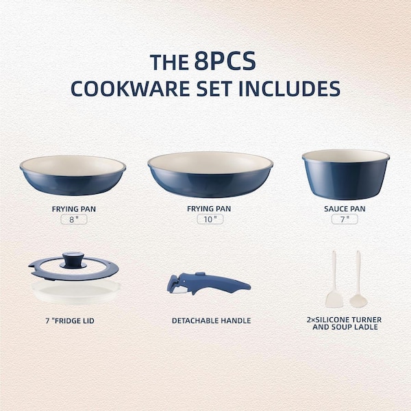 8-Piece Blue Ceramic Nonstick Cookware Set with Removable Handle, Stackable, Multi-Cooktop Compatible