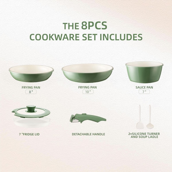 8-Piece Green Ceramic Nonstick Cookware Set with Removable Handle, Stackable, Multi-Cooktop Compatible