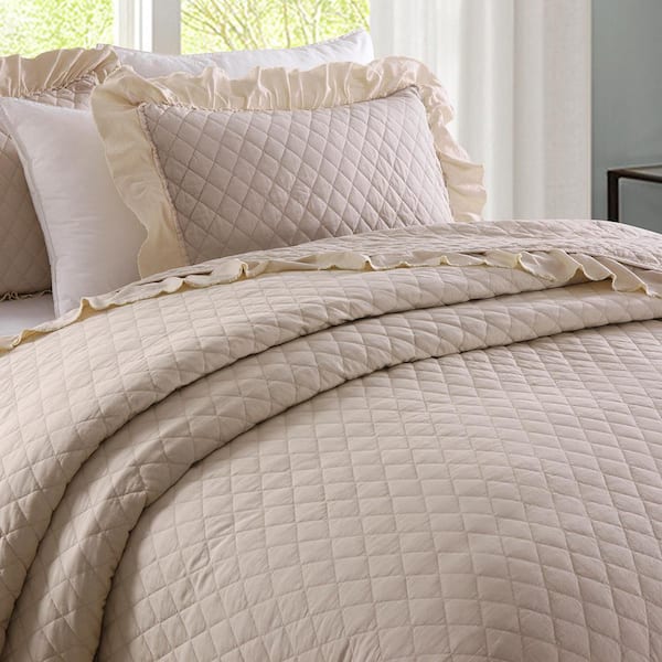 3-Piece Beige Microfiber King Ruffled Quilt Set
