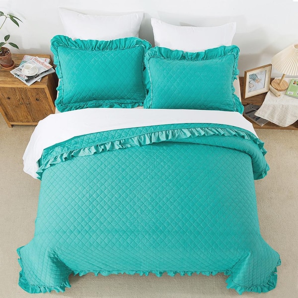 3-Piece Turquoise Microfiber Queen Ruffled Quilt Set