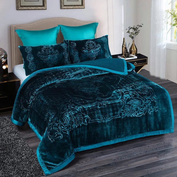 3 Pieces Teal Sherpa Fleece Blanket 79 in. x 91 in. with 2 Pillow Sham 20 in. x 30 in.