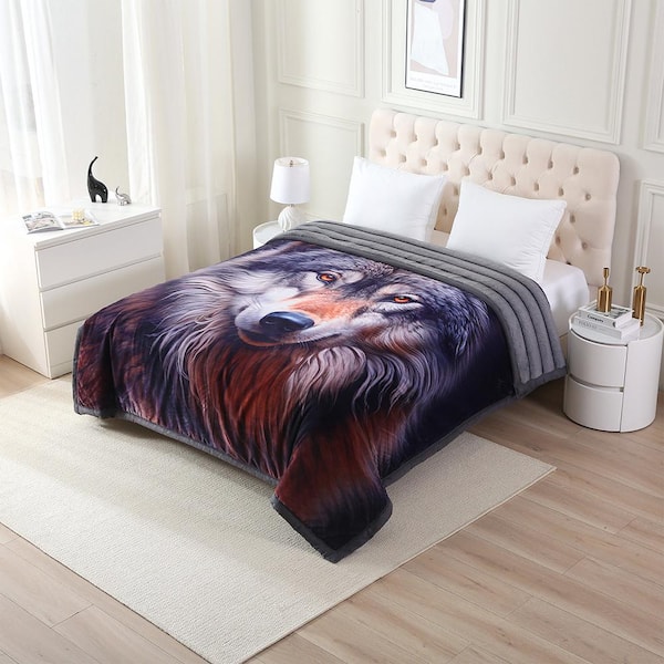 Wolf Pattern Rabbit Fur Blanket Striped Microfiber Plush Bed Blanket 85 in. x 93 in. 9LB