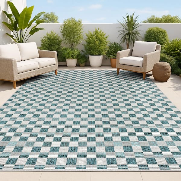 Aimee Traditional Cottage Checkerboard Turquoise/Cream 8 ft. x 10 ft. Indoor/Outdoor Area Rug