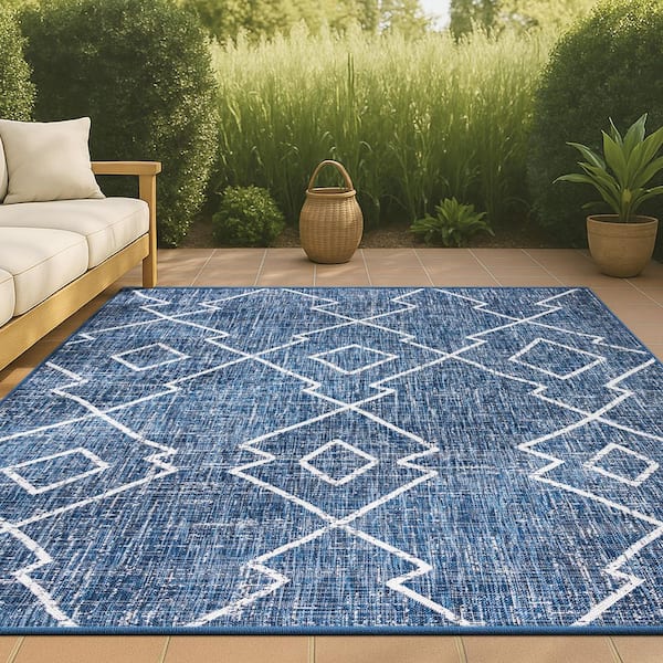 Carwa Blue/Ivory 5 ft. x 8 ft. Tribal Diamond Trellis Indoor/Outdoor Area Rug