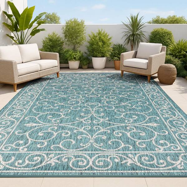 Charleston Vintage Filigree Textured Weave Indoor/Outdoor Teal/Gray 3 ft. x 5 ft. Area Rug