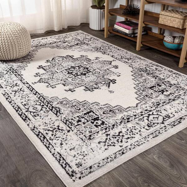 Inigo Black and White Cottage Medallion Dark Gray/Cream 4 ft. x 6 ft. Area Rug