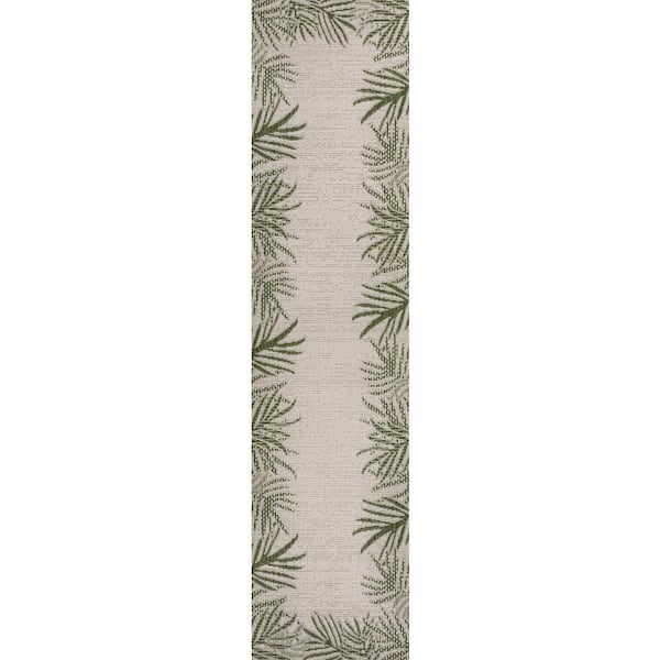 Isla Green/Cream 2 ft. x 8 ft. Coastal Cottage Palm Frond Border Indoor/Outdoor Runner Rug
