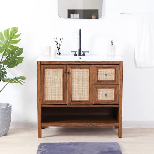 Jasper 36 in. W x 18 in. D x 33 in. H Rattan Modern Coastal 2-Shelf Bath Vanity Cabinet without Top in Walnut