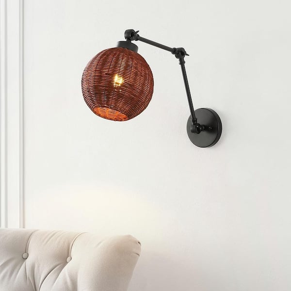 Lyla 22 in. 1-Light Dark Brown/Black Wall Sconce Mid-Century Vintage Rattan Globe Swing Arm LED