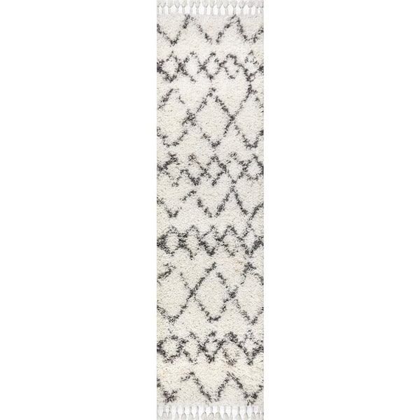 Mercer Shag Plush Tassel Moroccan Tribal Geometric Trellis Cream/Grey 2 ft. x 8 ft. Runner Rug