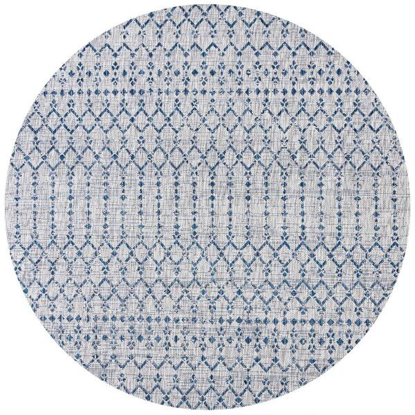 Ourika Moroccan Geometric Textured Weave Light Gray/Navy 5' Round Indoor/Outdoor Area Rug