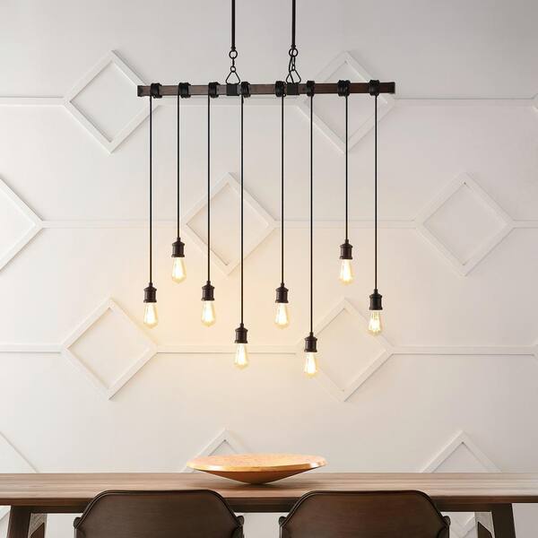 Rhys 40 in. 8-Light Brown Wood Finish/Black Chandelier Vintage Driftwood Iron LED Linear with Height Adjustable Bulbs