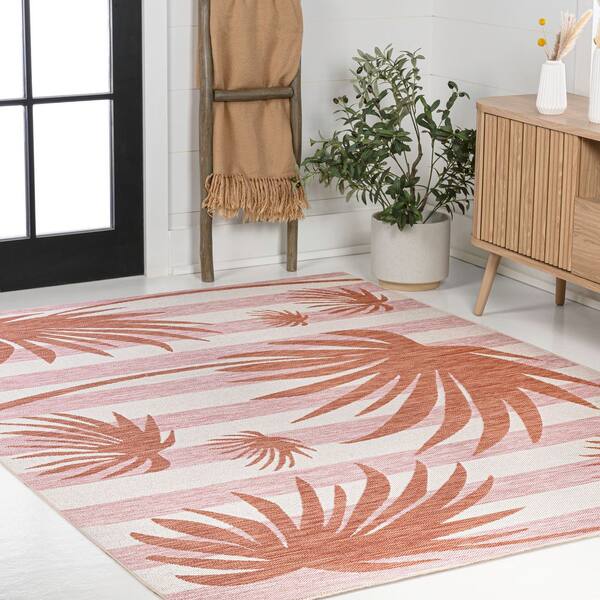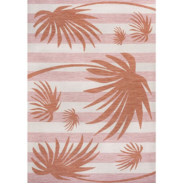 Veronica Classic Beach Stripe and Palm Leaf Pink/Cream 8 ft. x 10 ft. Indoor/Outdoor Area Rug