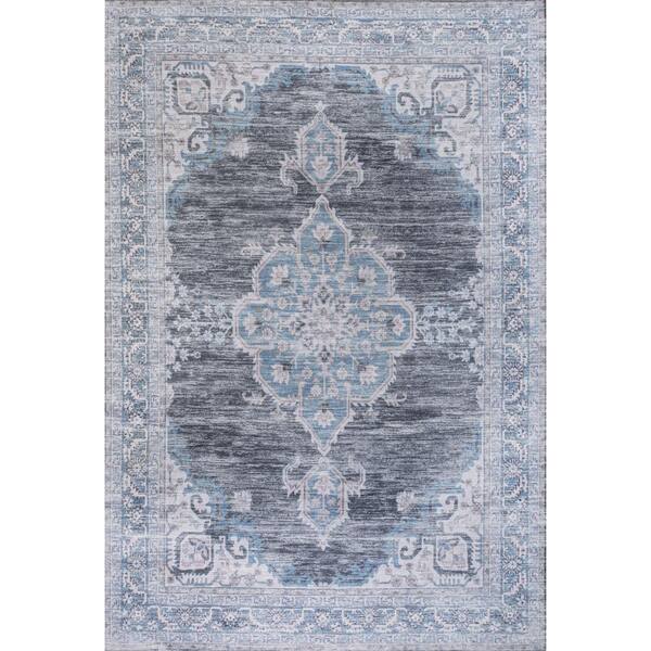 Wincer Chenille Cottage Medallion Machine-Washable Gray/Blue/White 4 ft. x 6 ft. Area Rug